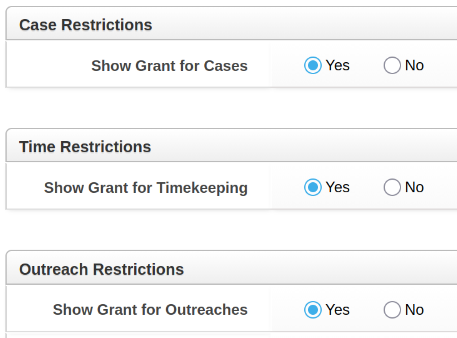 Whether your site is using basic or advanced filters, there are restrictions to completely allow or block a grant for Cases, Timekeeping, and Outreach: