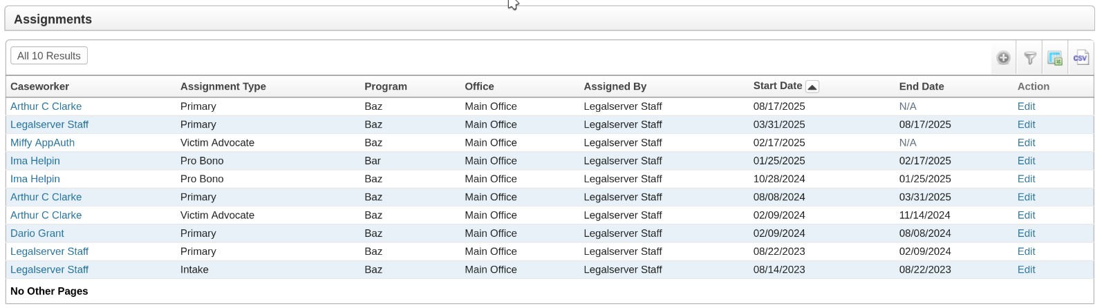The assignment history list (shown below) typically appears on case profiles, and each assignment has an Edit link to make changes to it.