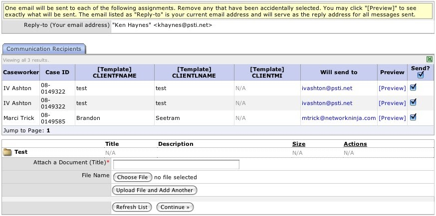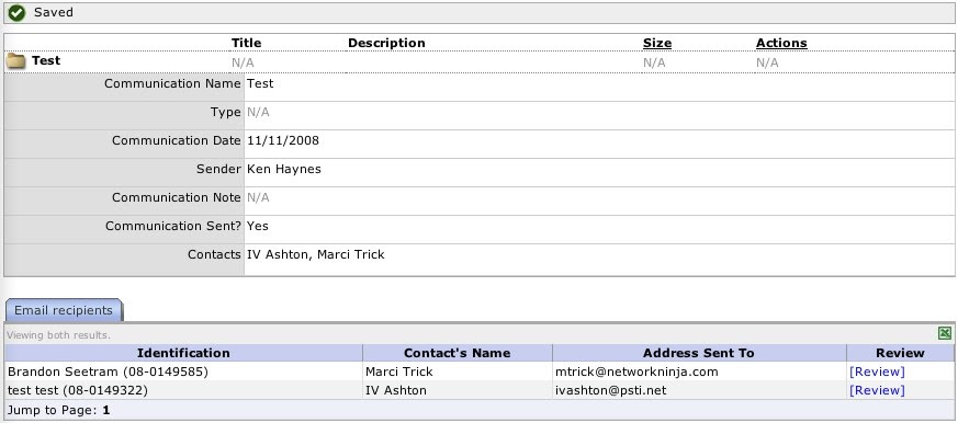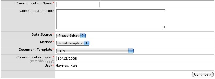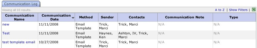 Creating a communication begins by clicking on the admin tab followed by the 'Communication' link. The communication log lists all the communications that have been sent and can be filtered by date.